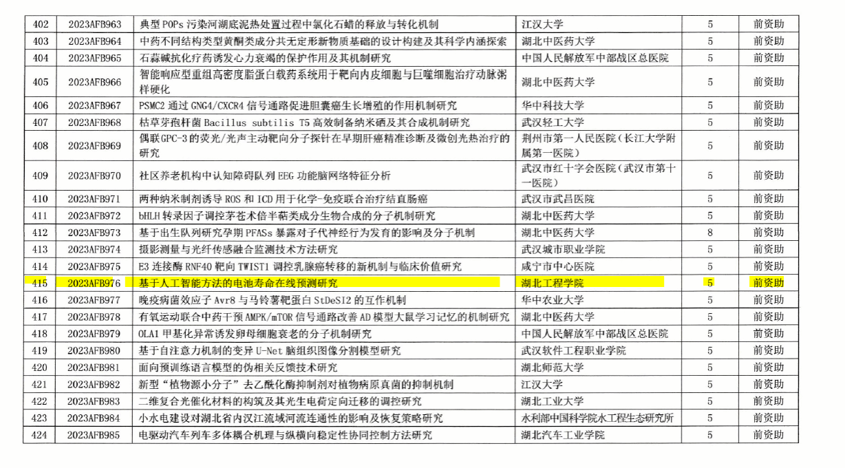 近日,湖北省科技厅布了《省科技厅关于下达2023年省自然科学基金计划项目的通知》,公司共有2项课题获批立项,分别是熊巍博士的《基于人工智能方法的电池寿命预测研究》和魏可可博士的《考虑流水孔溢流的潜艇上浮动运动特性研究》项目。
