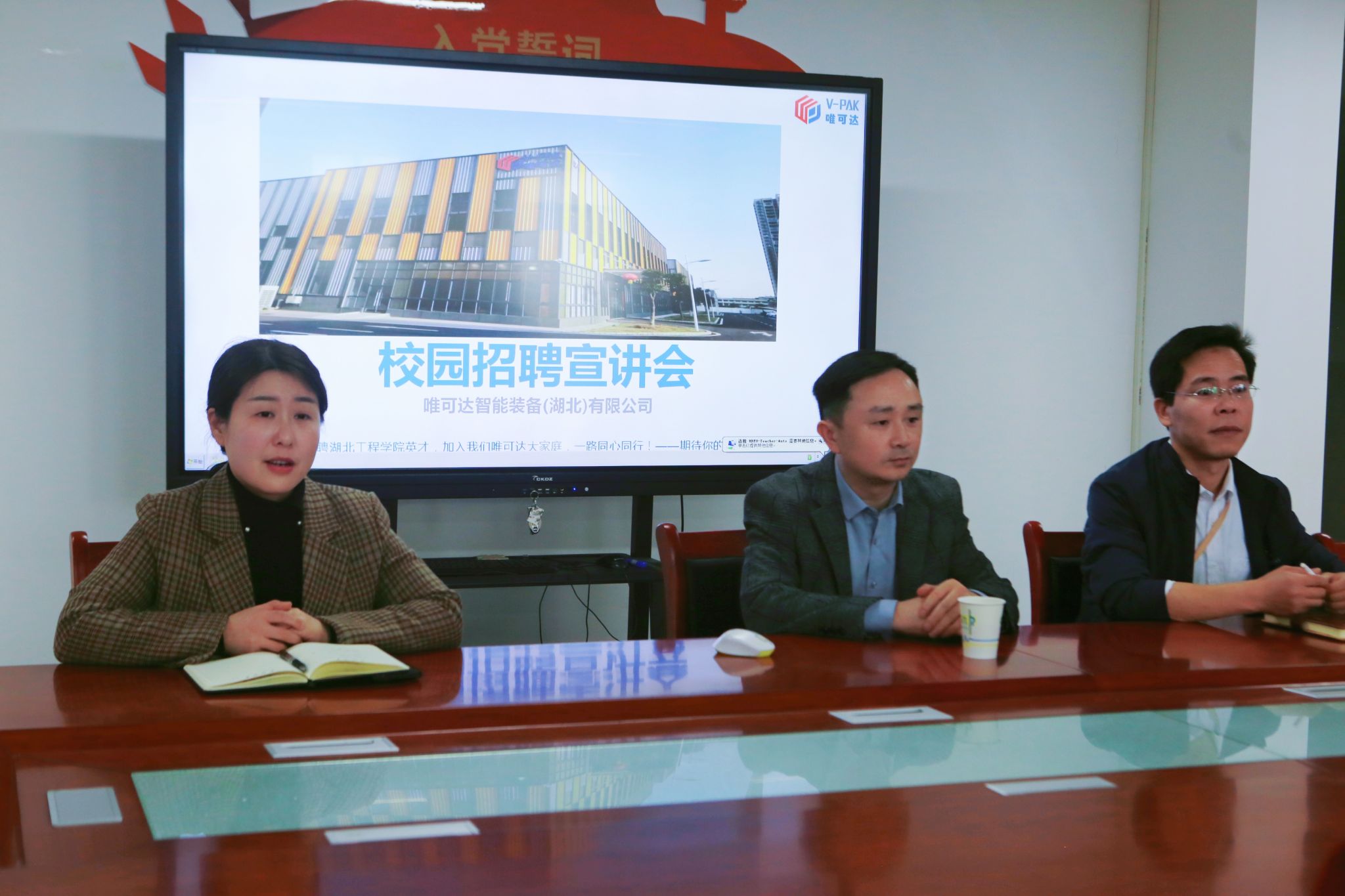 为进一步贯彻落实上级部门相关决策部署,做好当前和今后一段时期毕业生就业工作,公司多渠道开拓就业岗位,邀请企业进校开展专场校园招聘。3月22日下午,唯可达智能装备(湖北)有限公司在三园区1号楼413会议室举办专场招聘宣讲会,唯可达智能装备(湖北)有限公司董事长张艳洋、技术部经理侯修卫及人事行政主管张红伟参加会议,毕业年级辅导员及2024届在校员工参加了会议。会议由公司党委副书记杨晓薇主持。