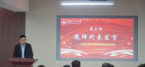 青年教师代表肖生浩博士发言,他结合个人求学、工作、生活的感悟,鼓励同学们严格自律,打磨自己,四年后遇见一个更好的自己。